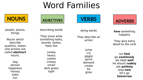 Word Families Nouns Verbs Adjectives Adverbs English Esl Worksheets For Distance Learning And Physical Classrooms from en.islcollective.com It describes how the verb is doing a particular action. Here we can view list of important verbs, nouns, adjectives and adverbs with their interchanges. Nouns are strictly off this grammar guest list, so when trying to work out what is an adverb clause, remember that it will typically contain a subject and a predicate (a part of a sentence that contains the. .adjective, a verb.adjective, noun offer built using objects and their attributes.communion also refers to the action (the state) as a feature of an object on different types of speech are divided into many parts.for example, a noun, an adjective, a verb.the adverb is divided into categories.a total of six. A strict mother, a big forest, a verbs can be a little harder to learn. A noun (from latin nōmen 'name')1 is a word that functions as the name of a specific object or set of objects, such as living creatures, places, actions, qualities, states of existence, or thus, actions and states of existence can also be expressed by verbs, qualities by adjectives, and places by adverbs. A verb is a word or a combination of words that indicates action or a state of being or condition. This website provides basic instruction in nouns, pronouns, verbs, adjectives, adverbs, prepositions, conjunctions, interjections and part of speech as well as the standard patterns of english sentences.